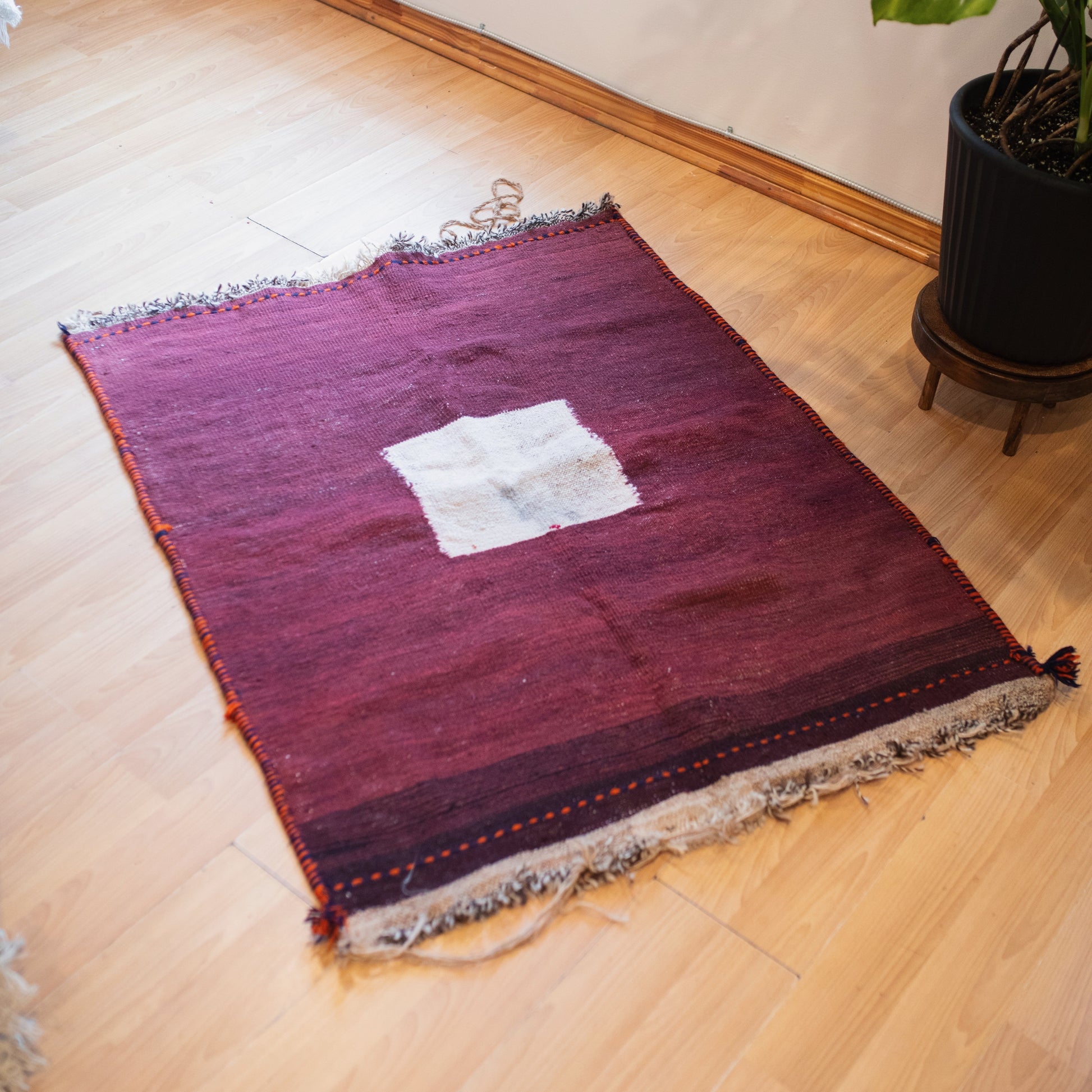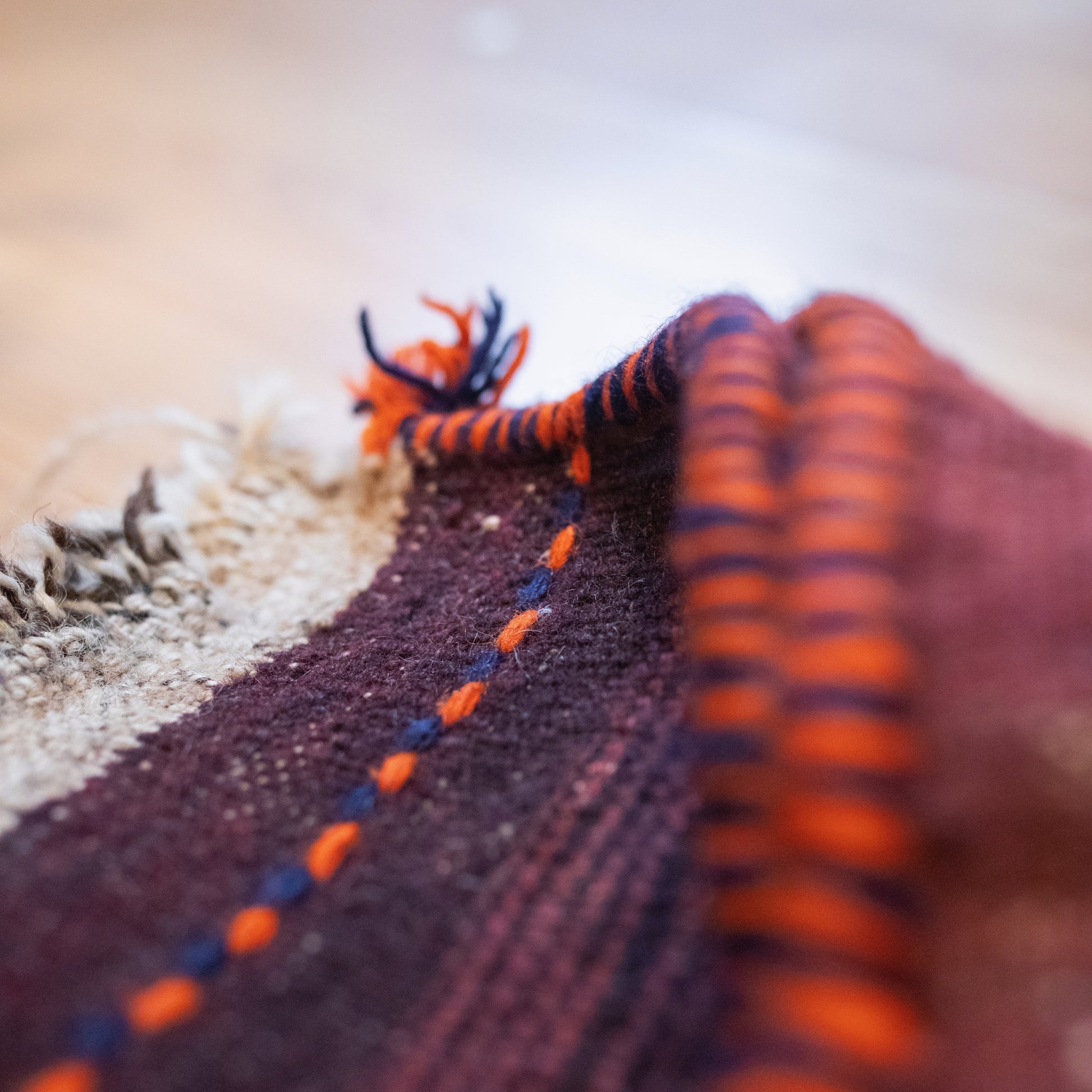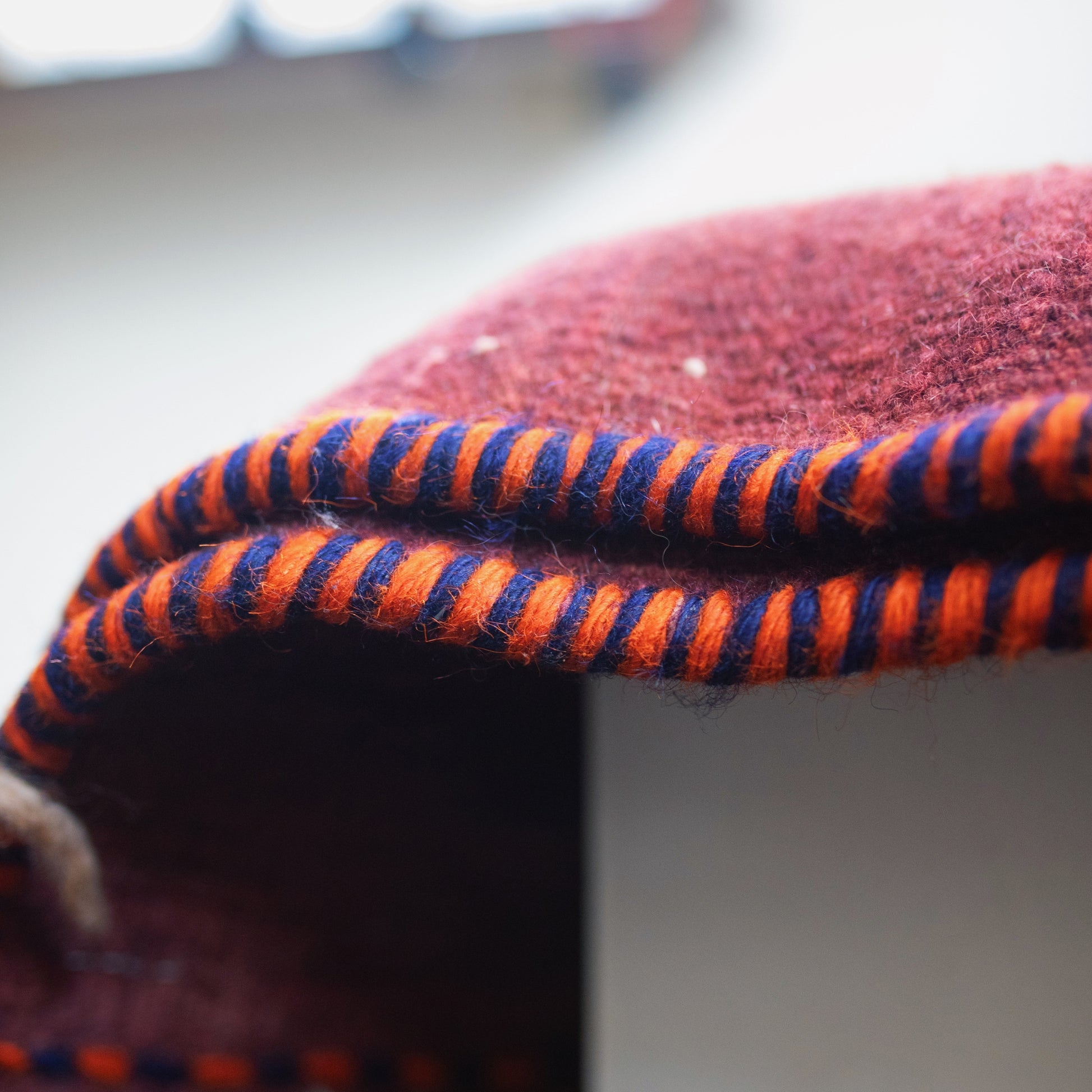 This vintage Balochi Sofreh from Khorasan features a deep, earthy plum-red field accented by a central ivory square. The edges are finished with vibrant orange and navy overcasting, adding a bold contrast to the otherwise minimalist design. Subtle decorative stitching in the same orange and navy runs parallel to each end, framing the piece with a touch of geometric rhythm.