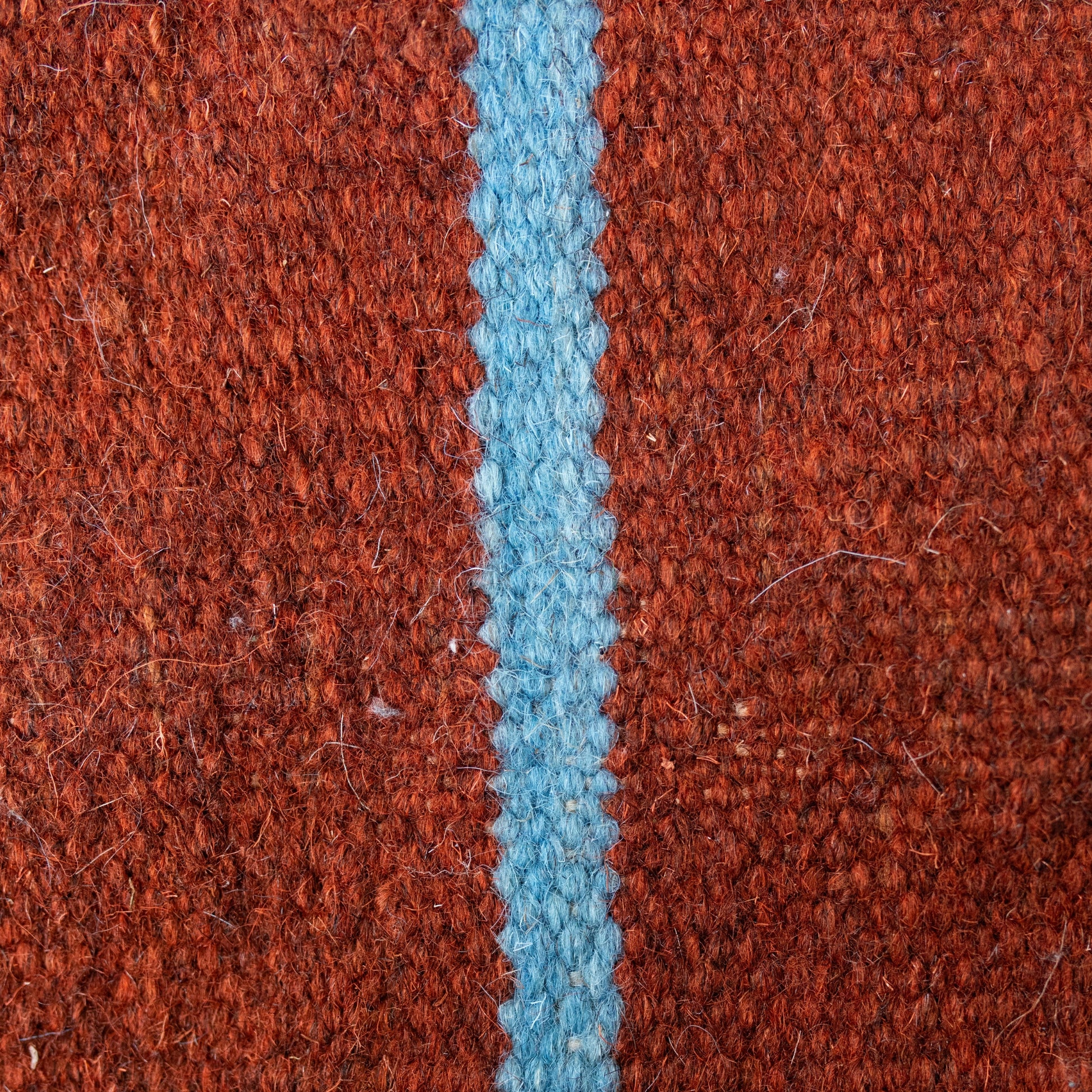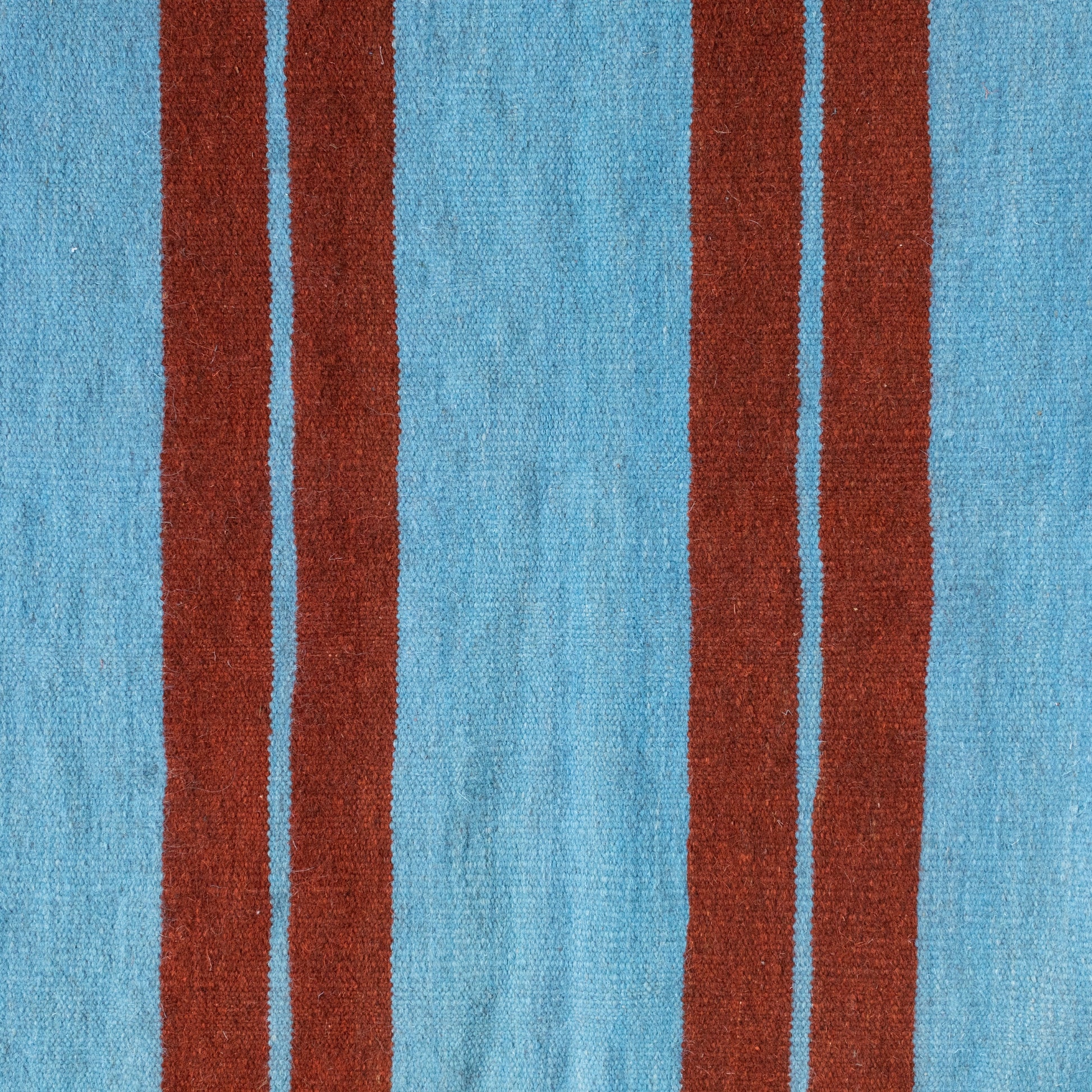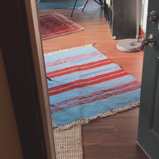 This Kilim Rug is a handwoven flatweave from Isfahan, featuring bold terracotta stripes across a sky-blue field. The minimalist yet striking design blends traditional craftsmanship with a modern aesthetic, making it a versatile piece for both interiors and outdoor living.